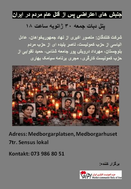 برگزاری سمیناری در استکهلم با حضور احزاب در مورد اوضاع سیاسی امروز و نقش جنبش های اعتراضی در مقابله با جمهوری جنایتکاران اسلامی، جمعه ۳۰ ژانویه 2026-01-29 اطلاعیه های خارج کشور Leave a comment به اشتراک بگذارید Facebook Twitter به اشتراک بگذارید Facebook Twitter
